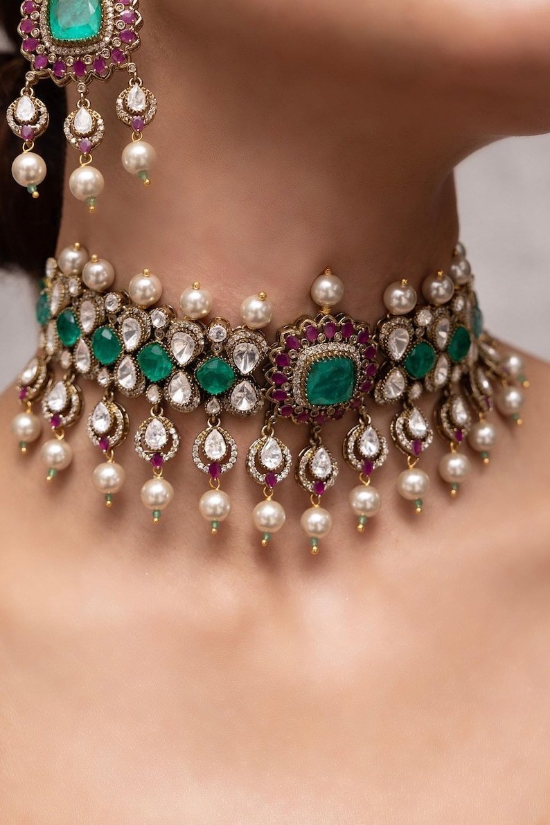 Pair this Bollywood pearl choker set with deep-neck blouses or embroidered outfits for a regal and fashionable statement.