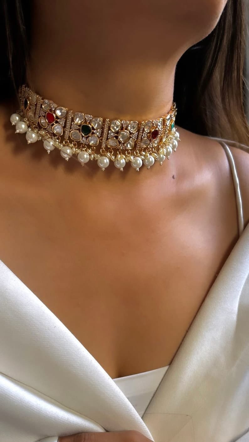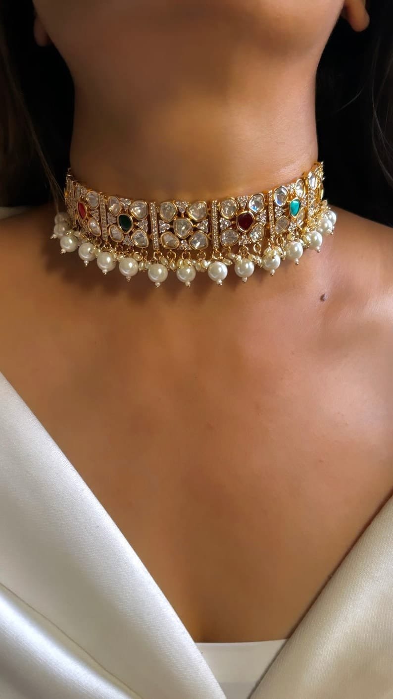 Description: A regal, semi-precious Navratan choker, blending traditional Indian charm with modern sophistication.