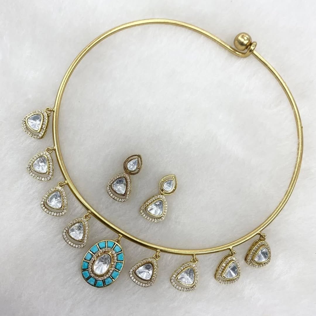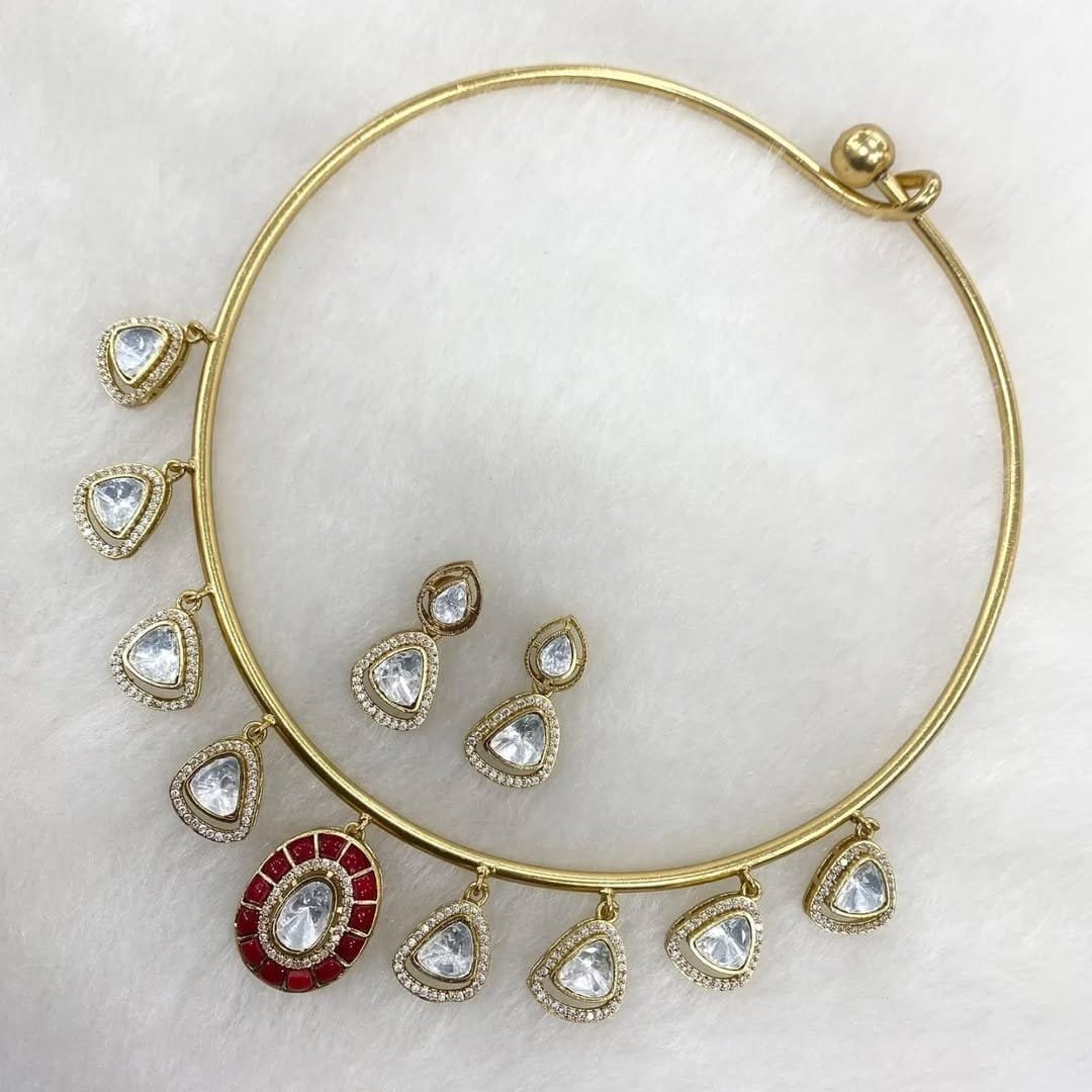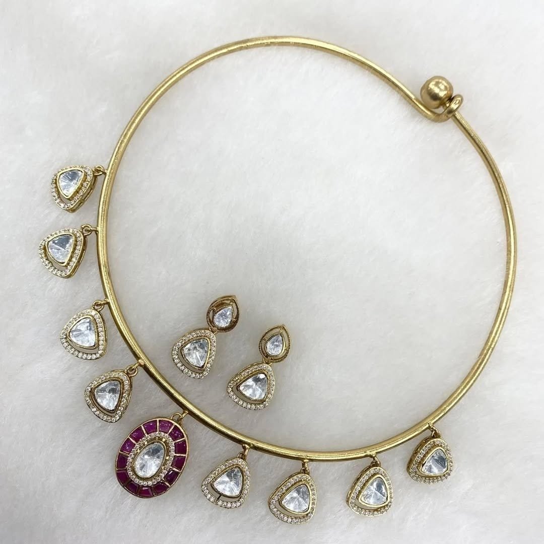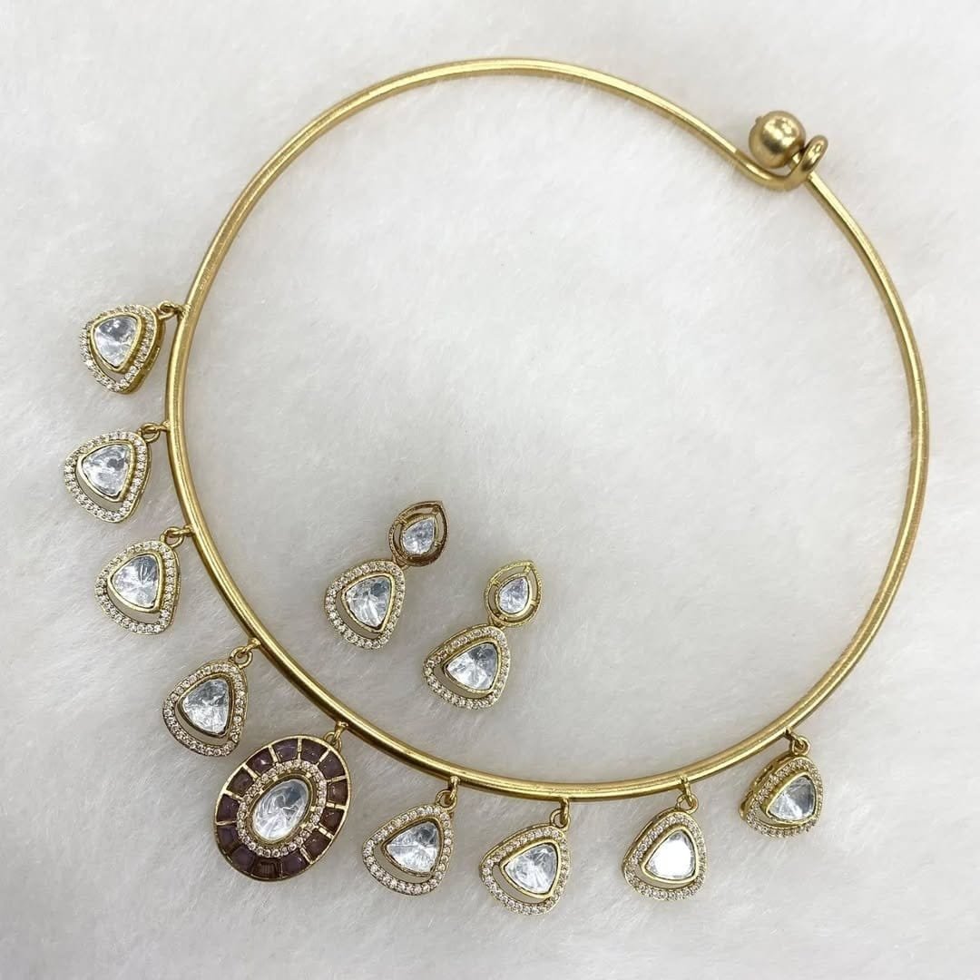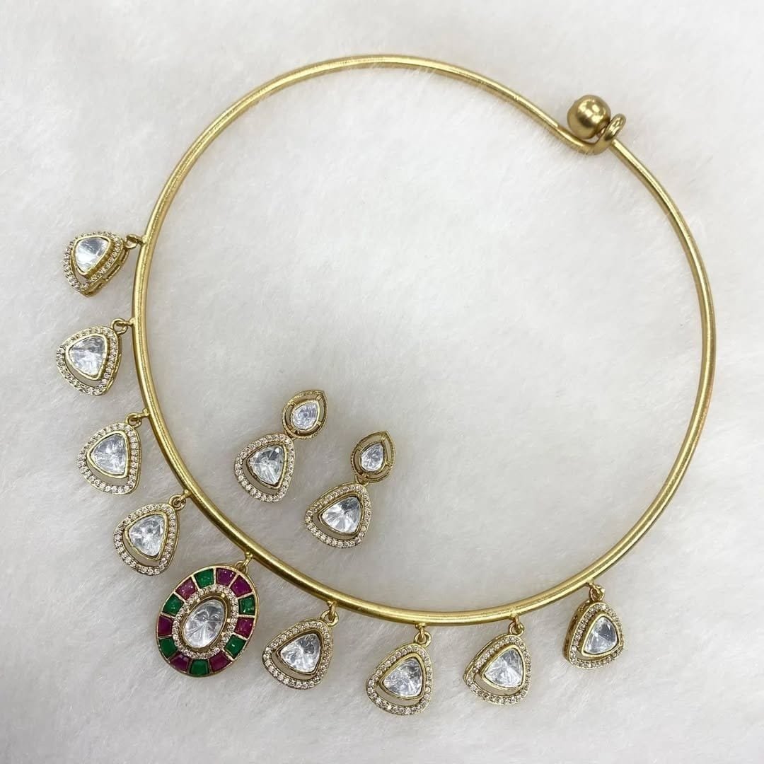 Anita Moissanite Polki Hasli is a stunning statement piece crafted with radiant Moissanite Polki stones and a rich gold-toned finish. Designed in a classic hasli style, this royal bridal jewellery adds timeless elegance and grandeur to wedding and festive looks.
