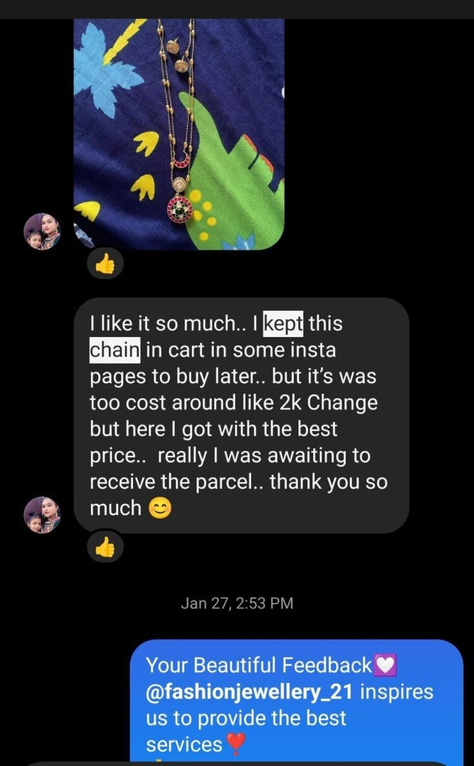 I recently purchased from FASHION_JEWELLERY21 Most viral -2layers CHAAND JADU SET and I’m really pleased with my experience. The jewelry is exactly as shown—stylish, well-crafted, and feels high-quality. Shipping was quick and the packaging was elegant, adding a nice touch. Customer service was responsive and helpful when I had a sizing question. I would definitely recommend FASHION_JEWELLERY21 to anyone looking for trendy, affordable fashion jewellery.