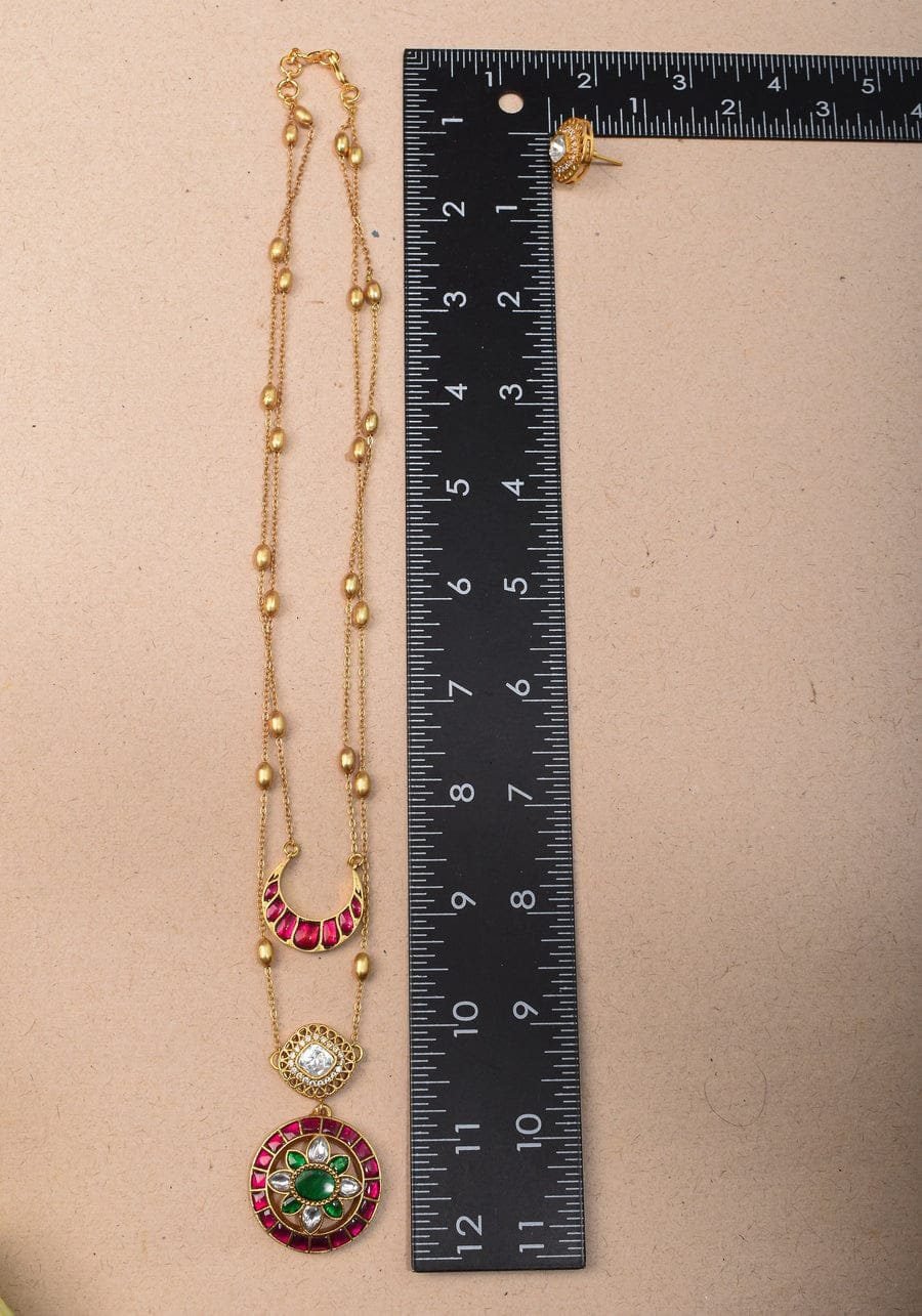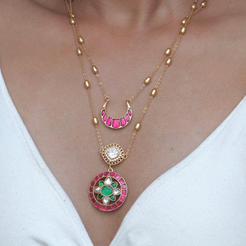 Description: A stylish and viral 2-layer Jadau Chaand pendant set that adds a touch of elegance to any ensemble.