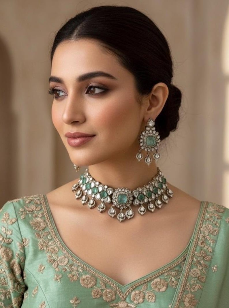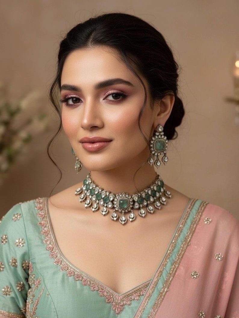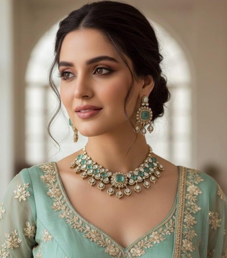 Step into royal elegance with the Nishvika Maharani Aura Regal Choker Set, a timeless creation that celebrates grandeur and grace. Adorned with radiant Polki stones, doublet gems, and lustrous pearls, this masterpiece captures the essence of maharani-inspired beauty and heritage craftsmanship.