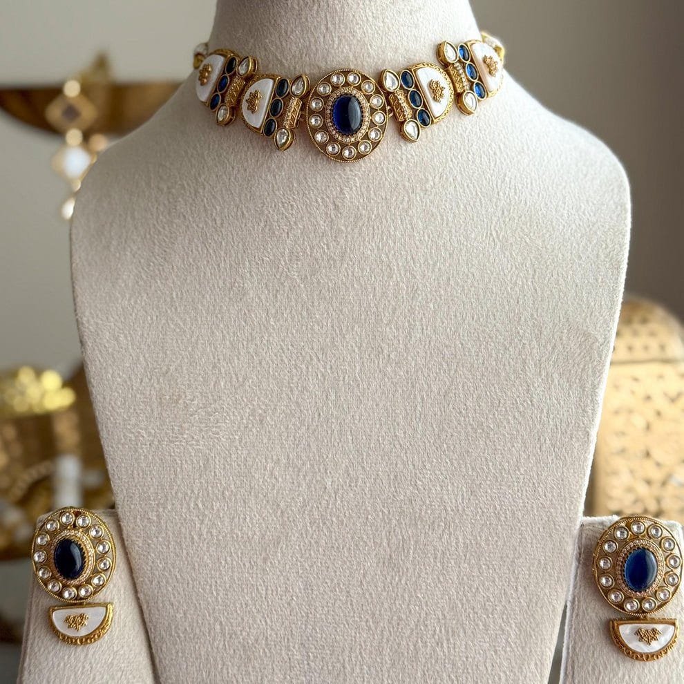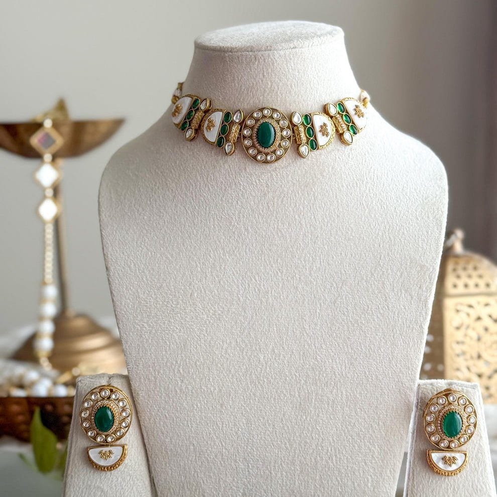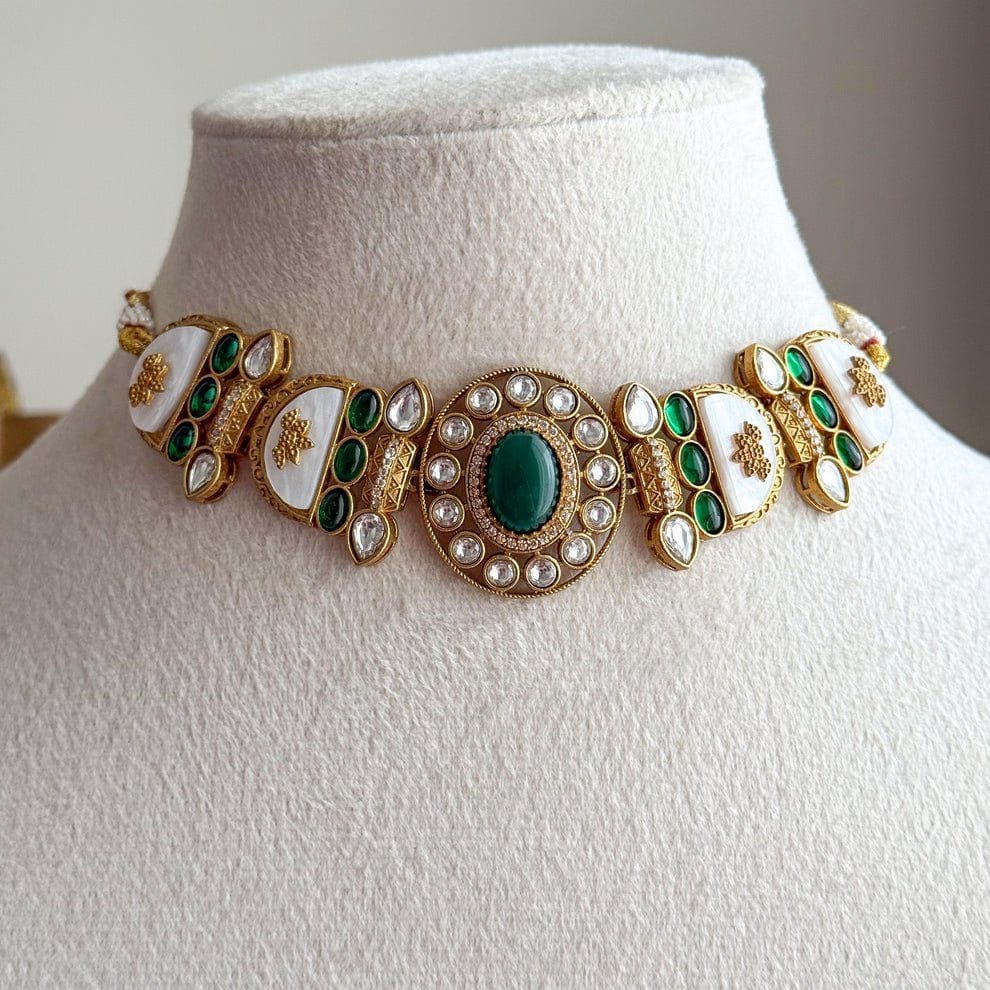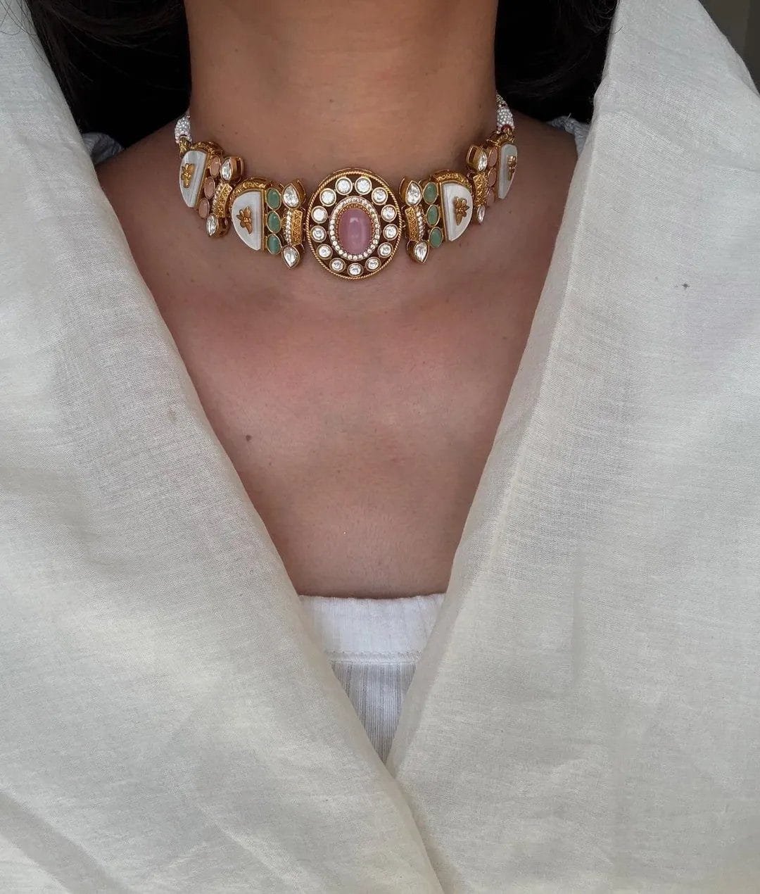 Soundarya Sabyasachi Styled Choker Set is exquisitely crafted with a premium stone setting and a rich gold-plated finish, reflecting timeless royal elegance inspired by classic Sabyasachi jewellery. Designed to enhance bridal and festive looks, this choker set adds a bold yet graceful statement to traditional ensembles.
